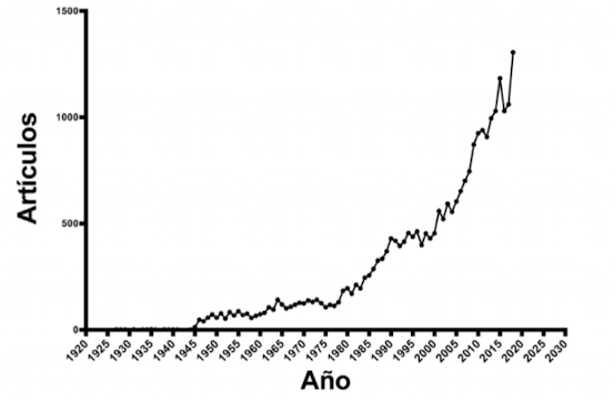 Evolución del número de artículos recogidos por año en la base PubMed relacionados con endometriosis.