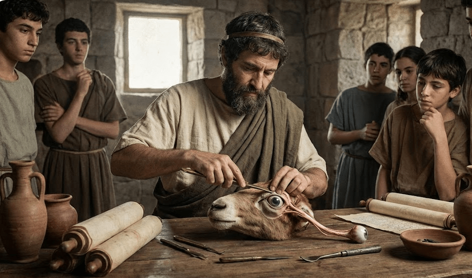 Recreación de Alcmeón diseccionando el globo ocular de una animal.