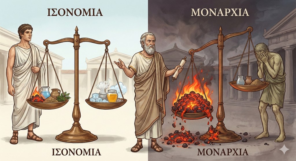 - Salud (Isonomía): Es el equilibrio democrático o mezcla proporcionada de cualidades opuestas (calor-frío, húmedo-seco, amargo-dulce). Existe una «igualdad de derechos» entre las potencias.