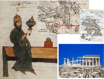 Mapa de la Grecia antigua con la isla de Egina en el golfo Sarónico. Su importancia como potencia marítima facilitó que médicos de esta región tuvieran una visión cosmopolita y viajera. bajo a la derecha se observa el imponente templo dórico de Egina. Abajo a la derecha se observa el imponente templo dórico de Egina (Templo de Afaya)