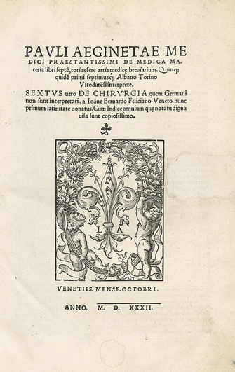 Frontispicio de una edición latina de la Methodus medendi (método de tratamiento) de Galeno (París 1530), representa los grandes médicos de la Antoguedad y donde Pablo de Egina está bajo Hipócrates.