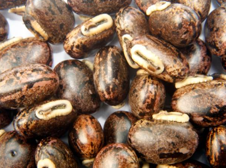 Semillas de Mucuna pruriens, cuyo polvo contiene cantidades apreciables de Levodopa.