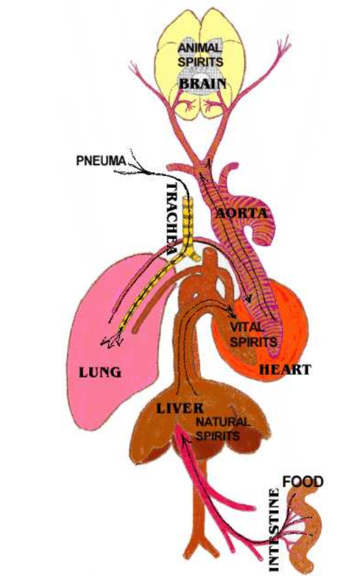 Galeno de Pérgamo (siglo II e.c.) fue el gran sintetizador. Propuso la teoría de los espíritus animales: Los alimentos se transforman en espíritus naturales en el hígado, posteriormente se convierten en espíritus vitales en el corazón y finalmente, llegan al cerebro para transformarse en espíritus animales o psíquicos, los cuales viajan por los nervios (vistos como canales huecos) para producir el movimiento y la sensación.