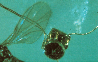 El motor eléctrico de William McLellan, ganador del premio. Se observa junto al ala de un mosquito.