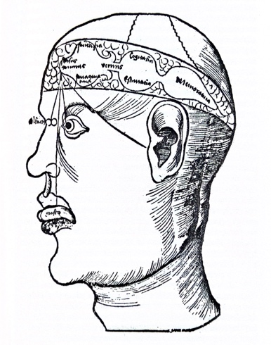 Localización de las facultades mentales en los “ventrículos cerebrales”, según Posidonio (siglo IV). Xilografía de 1503.