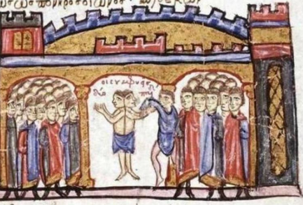 Miniatura de un manuscrito medieval (Madrid Skylitzes también conocido como Codex Graecus Matritensis), una crónica ilustrada de la historia bizantina escrita por Juan Escilitzes en el siglo XII y que representa a unos siameses. Según la tradición fueron separados quirúrgicamente, falleciendo uno de ellos.